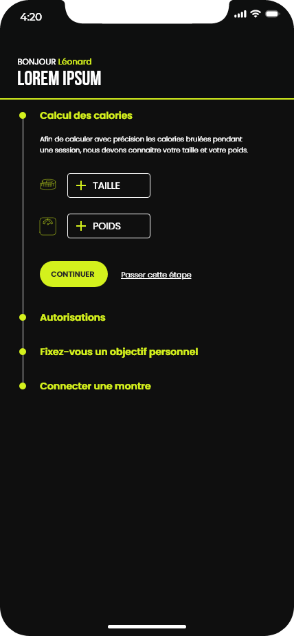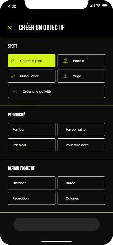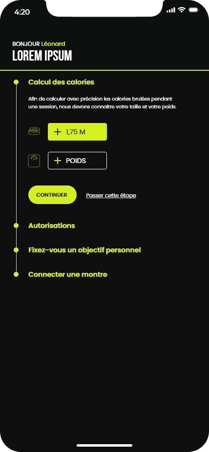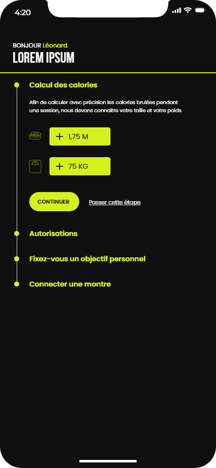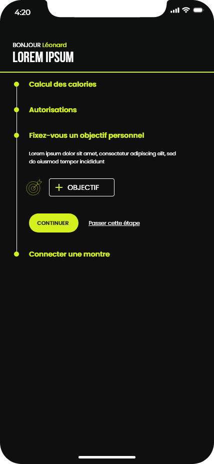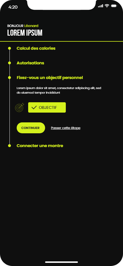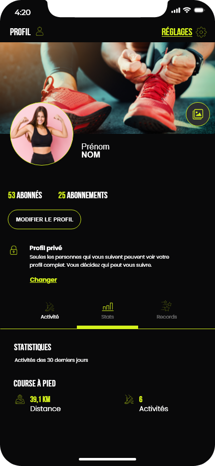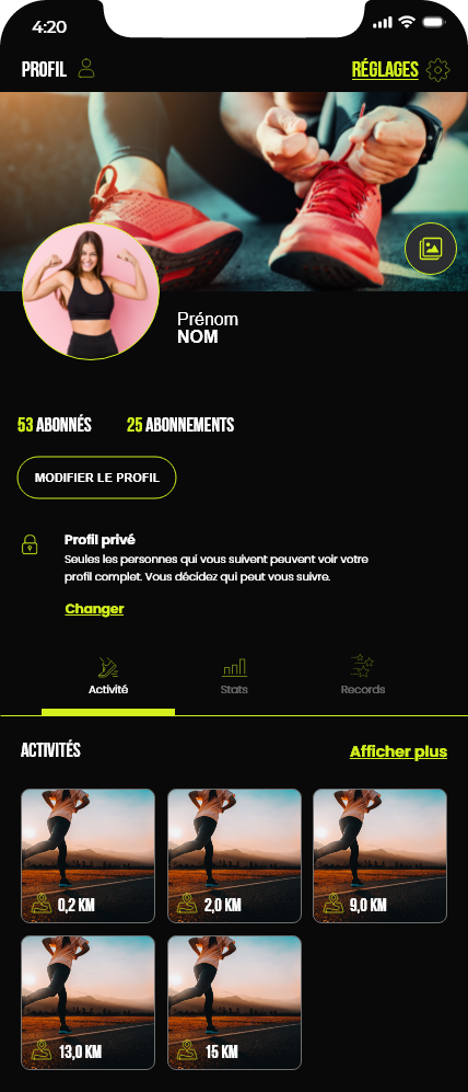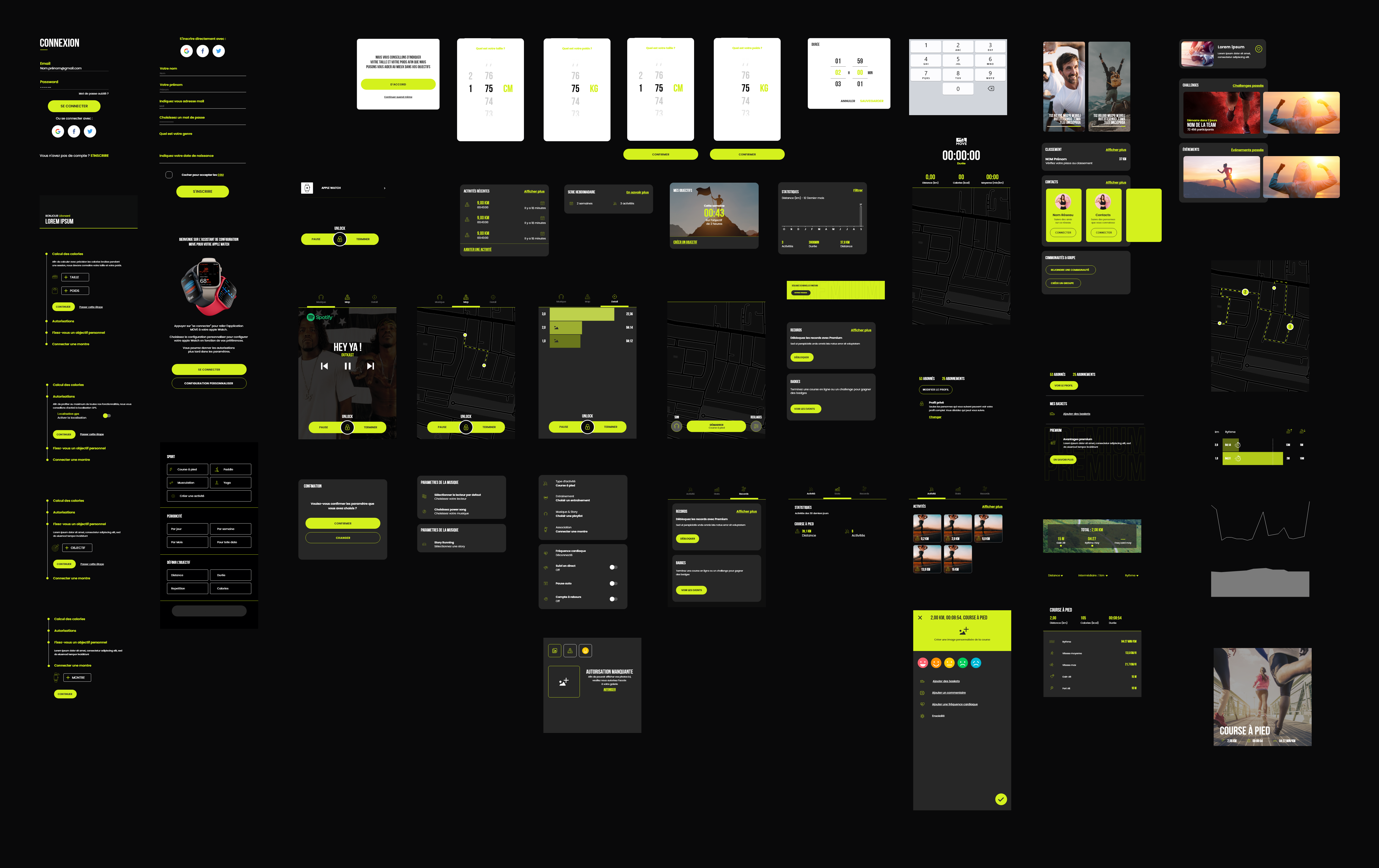 Ce projet consistait à concevoir les maquettes d’une application de running. Le travail a débuté par la création d’un design system basé sur la méthodologie Atomic Design, ainsi que par l’élaboration de la charte graphique de l’application. Ces éléments ont ensuite servi de base pour réaliser l’ensemble des maquettes de l’interface.